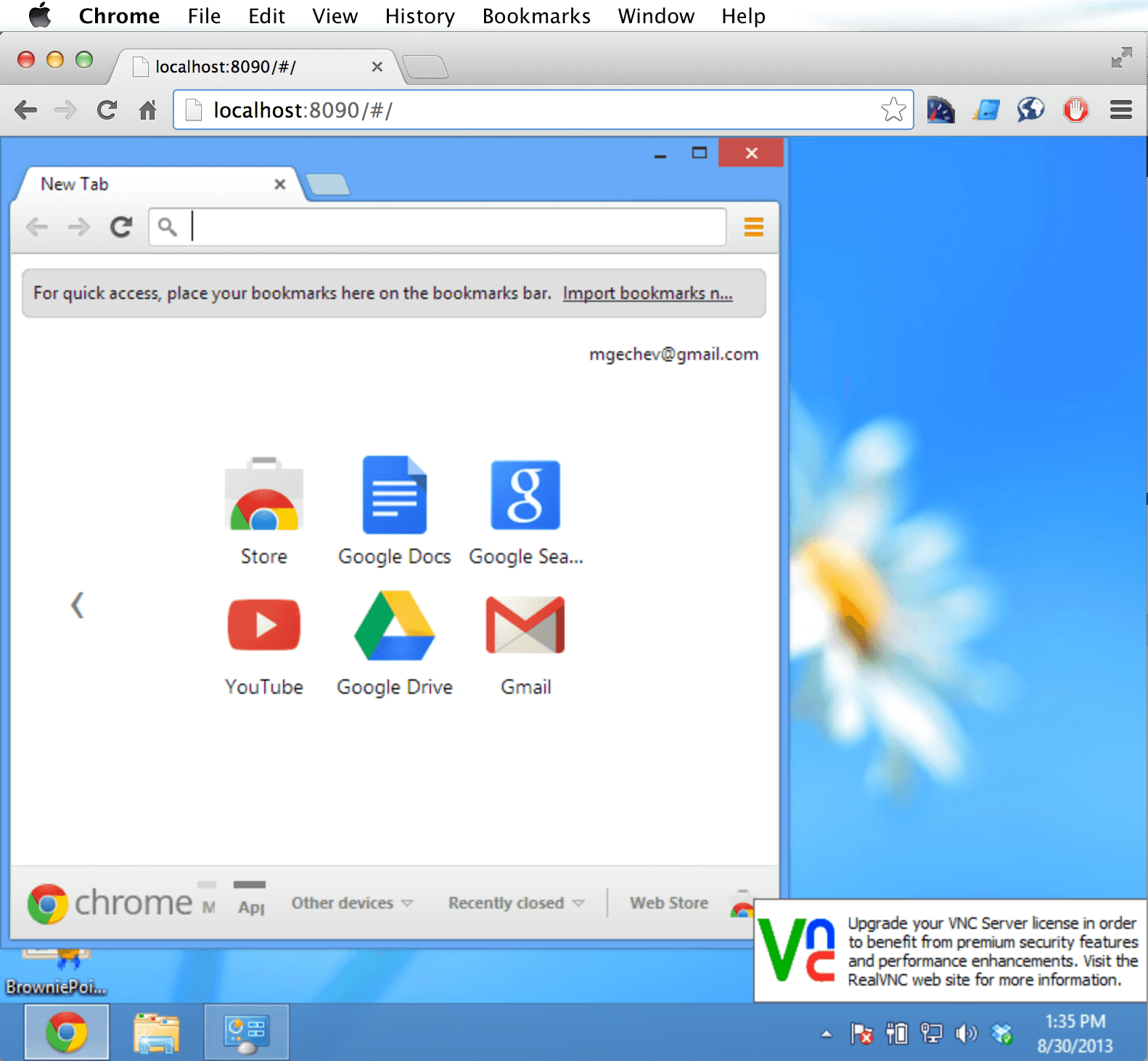 Our application will have very simple architecture – a proxy server written in Node.js and a client in HTML5 and JavaScript. The Node.js server will stay between the browser and the VNC server. We need it because the client-side JavaScript does not supports TCP sockets so we can’t connect directly to the VNC server. The HTML5 client will have a canvas on which we will draw the frames we receive from the server. For VNC server you can use the free version of RealVNC.